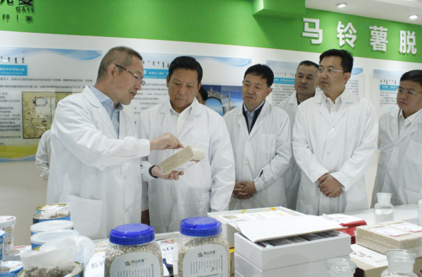 段志強一行首先參觀了民豐種業(yè)脫毒組培中心展廳,詳細(xì)了解了馬鈴薯脫毒種薯生產(chǎn)過程及企業(yè)發(fā)展情況。張國介紹,內(nèi)蒙古民豐種業(yè)有限公司成立于2008年,注冊資本1.3億元,已累計完成投資10億元以上,公司已發(fā)展成為集馬鈴薯種薯、訂單薯生產(chǎn)及馬鈴薯、燕麥深加工于一體的全產(chǎn)業(yè)鏈集團化企業(yè),是“農(nóng)業(yè)產(chǎn)業(yè)化國家重點龍頭企業(yè)”、“國家高新技術(shù)企業(yè)”、“自治區(qū)扶貧龍頭企業(yè)”。目前,公司已發(fā)展成為一家融合農(nóng)業(yè)和食品加工業(yè)的全產(chǎn)業(yè)鏈集團化公司,形成以食品加工帶動農(nóng)業(yè),以農(nóng)業(yè)服務(wù)食品加工,一、二、三產(chǎn)融合、農(nóng)商互聯(lián)齊頭并進的良性發(fā)展業(yè)務(wù)格局。