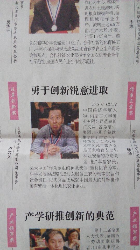 日前,全國“北大荒”杯2013年度“中國農(nóng)村新聞人物”評選活動(dòng)揭曉,內(nèi)蒙古民豐薯業(yè)有限公司董事長盧文兵光榮當(dāng)選,獲“改革創(chuàng)新獎(jiǎng)”。